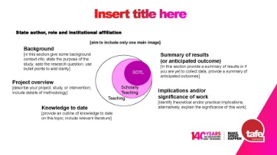 Following the same suggested structure for the abstract and presentation, the poster also includes an outline of essential elements of your scholarship or research project. Those opting for a poster submission are welcome to be as creative as they choose.